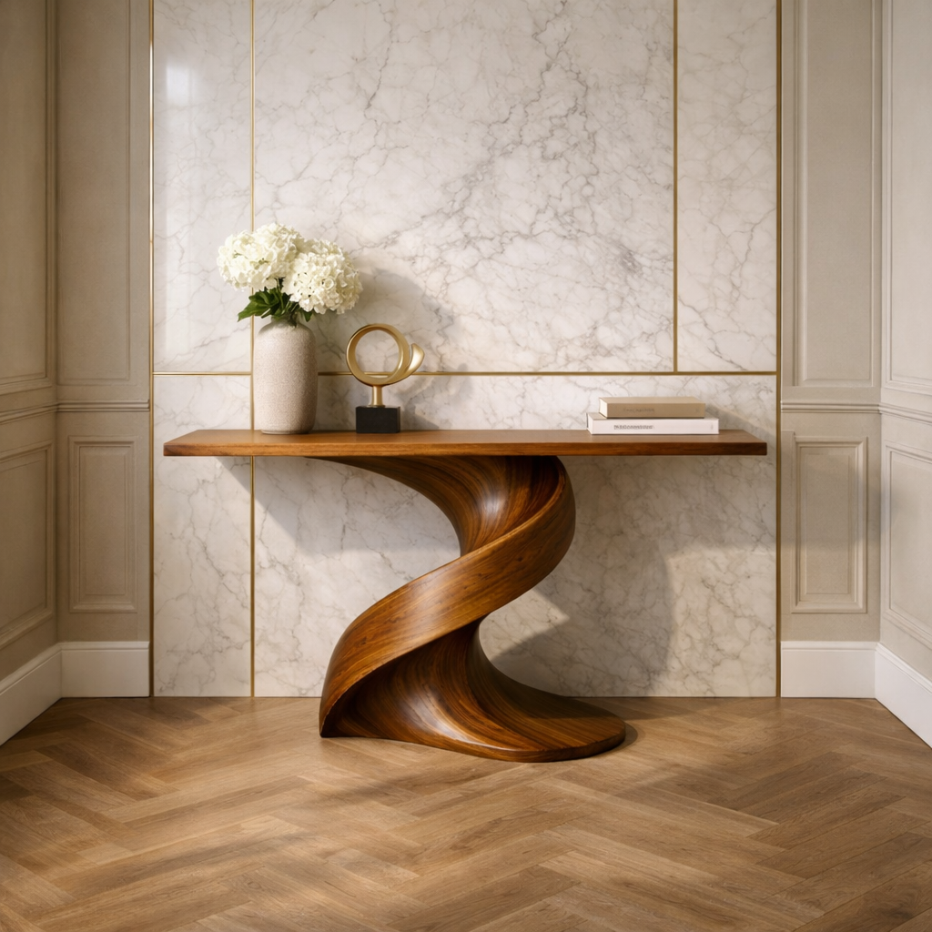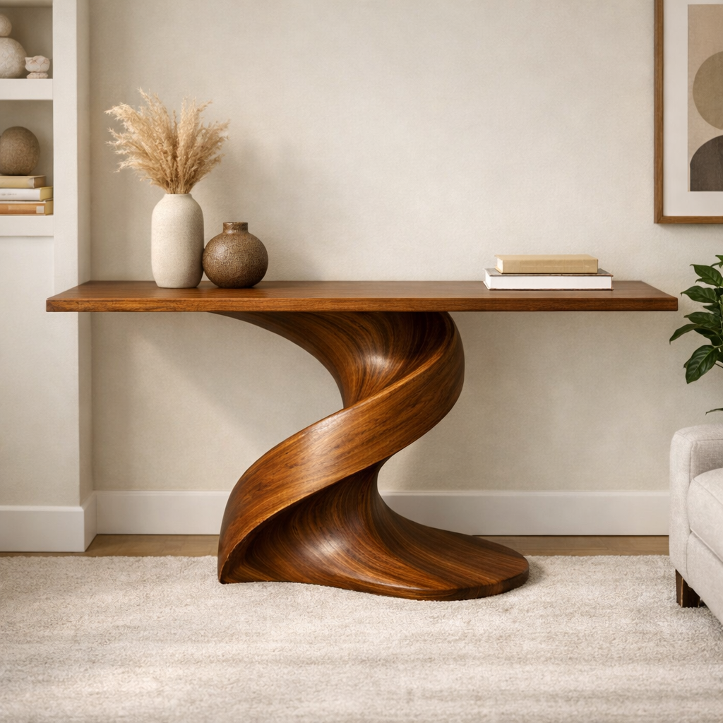 A handcrafted solid wood console table with a long, clean top and a dramatic sculptural twist base. The flowing curves and rich grain create a refined statement piece for entryways, hallways, or behind a sofa.