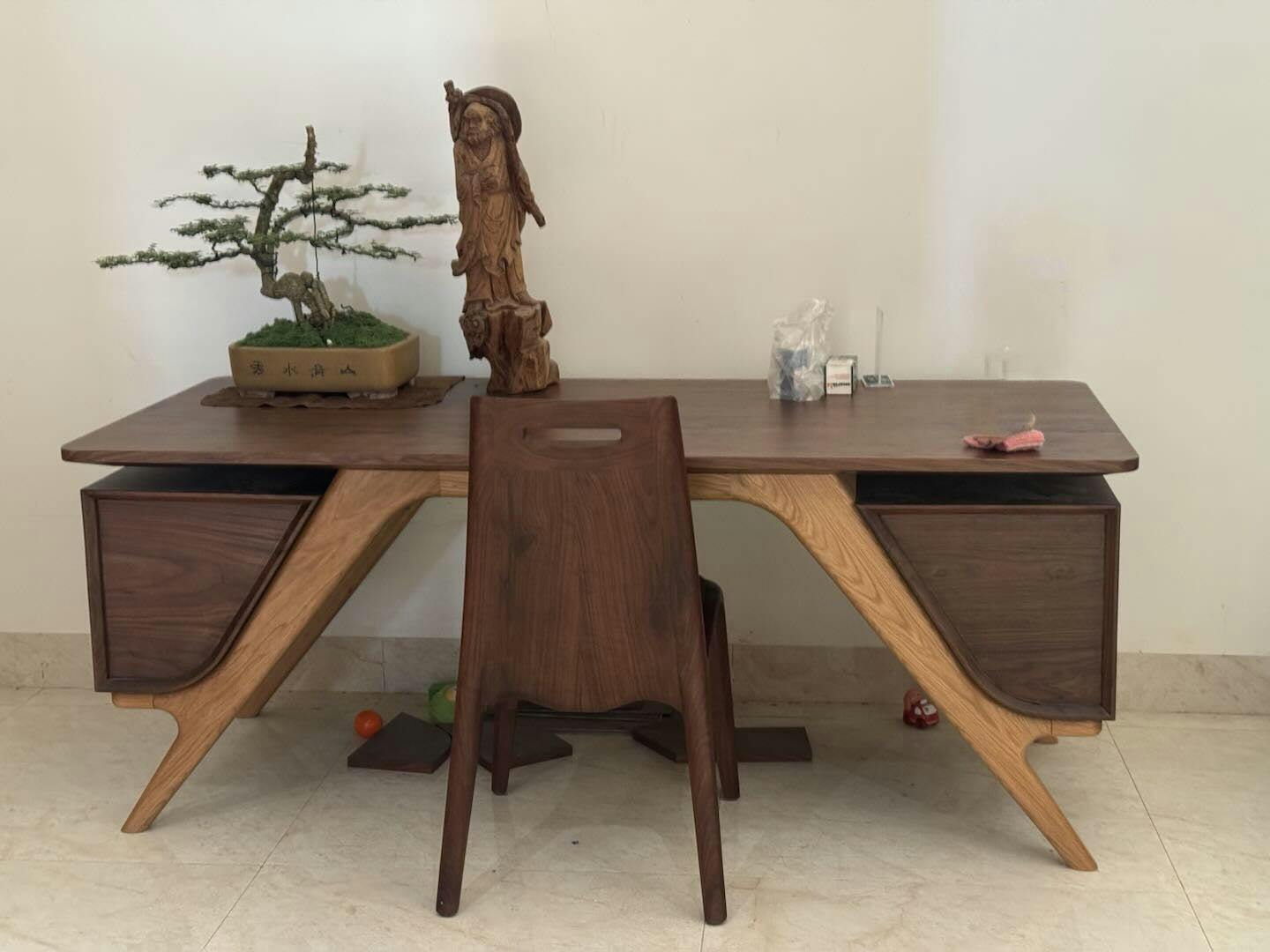 A statement desk handcrafted from solid natural wood with a wide work surface and a refined, architectural base. Angled legs and integrated side storage create a balanced mix of function and sculptural design. Made for focused work at home, with space for a laptop, books, and daily essentials.
