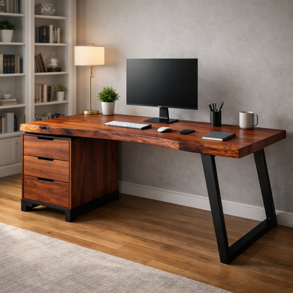 Handcrafted Solid Wood Desk With Live-Edge Top and Metal Base