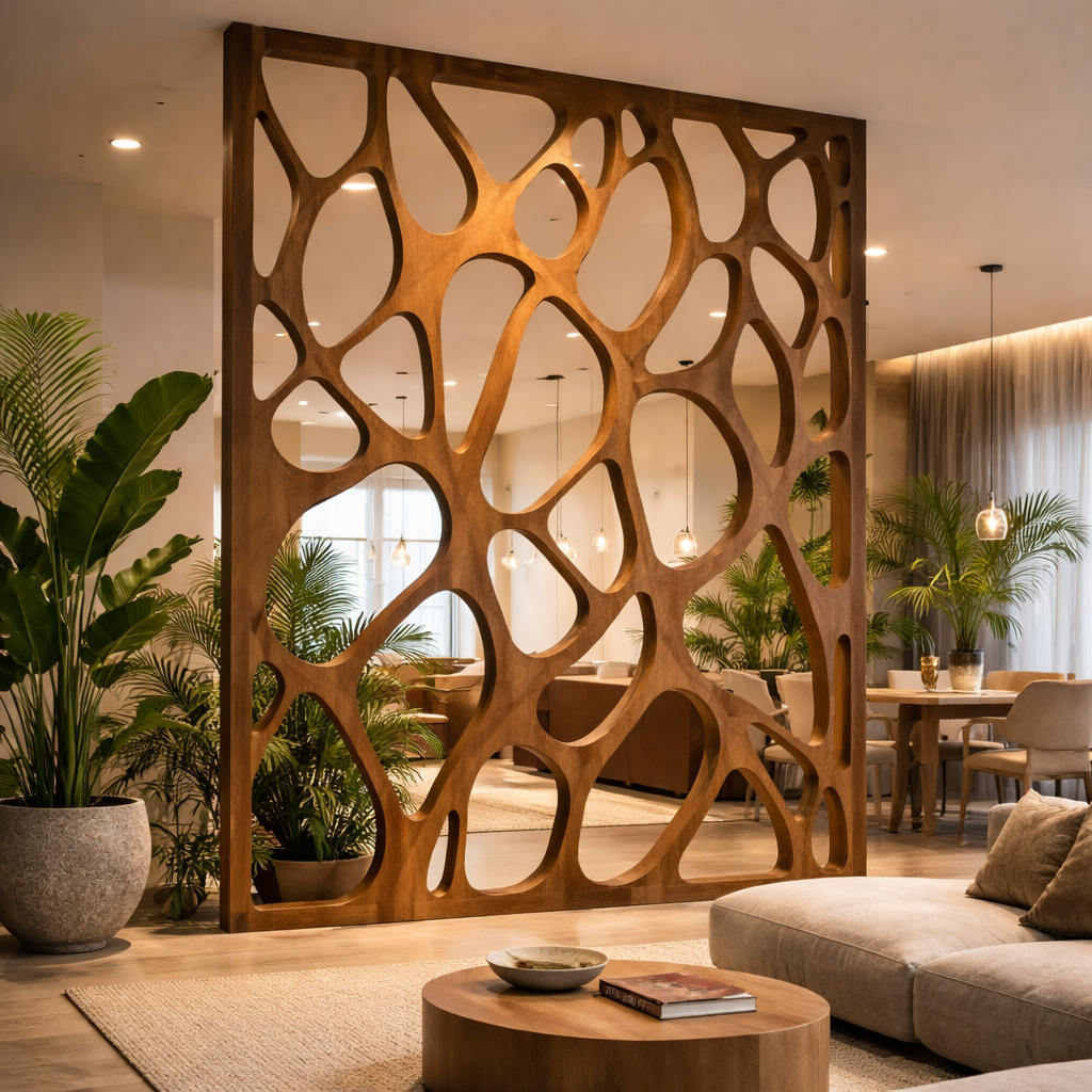 A sculptural room divider handcrafted from solid natural wood to shape open-plan living with warmth and light. The large organic cutout pattern creates separation while keeping the space airy and connected. Designed as a bold architectural feature for living rooms, dining areas, and modern open interiors.