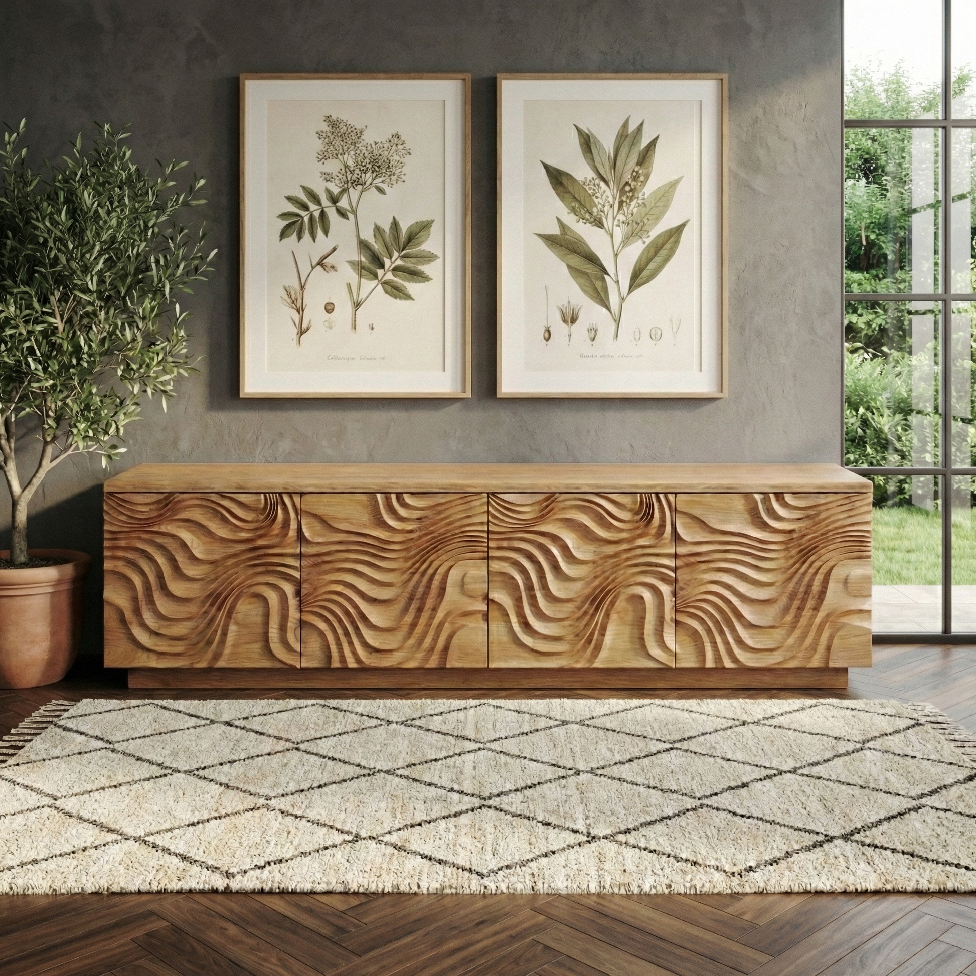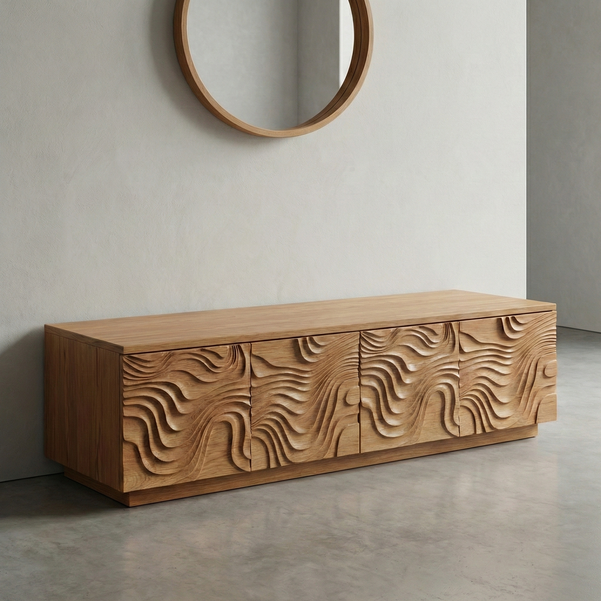 - Texture: carved 3D wave door panels with natural grain movement and handmade character