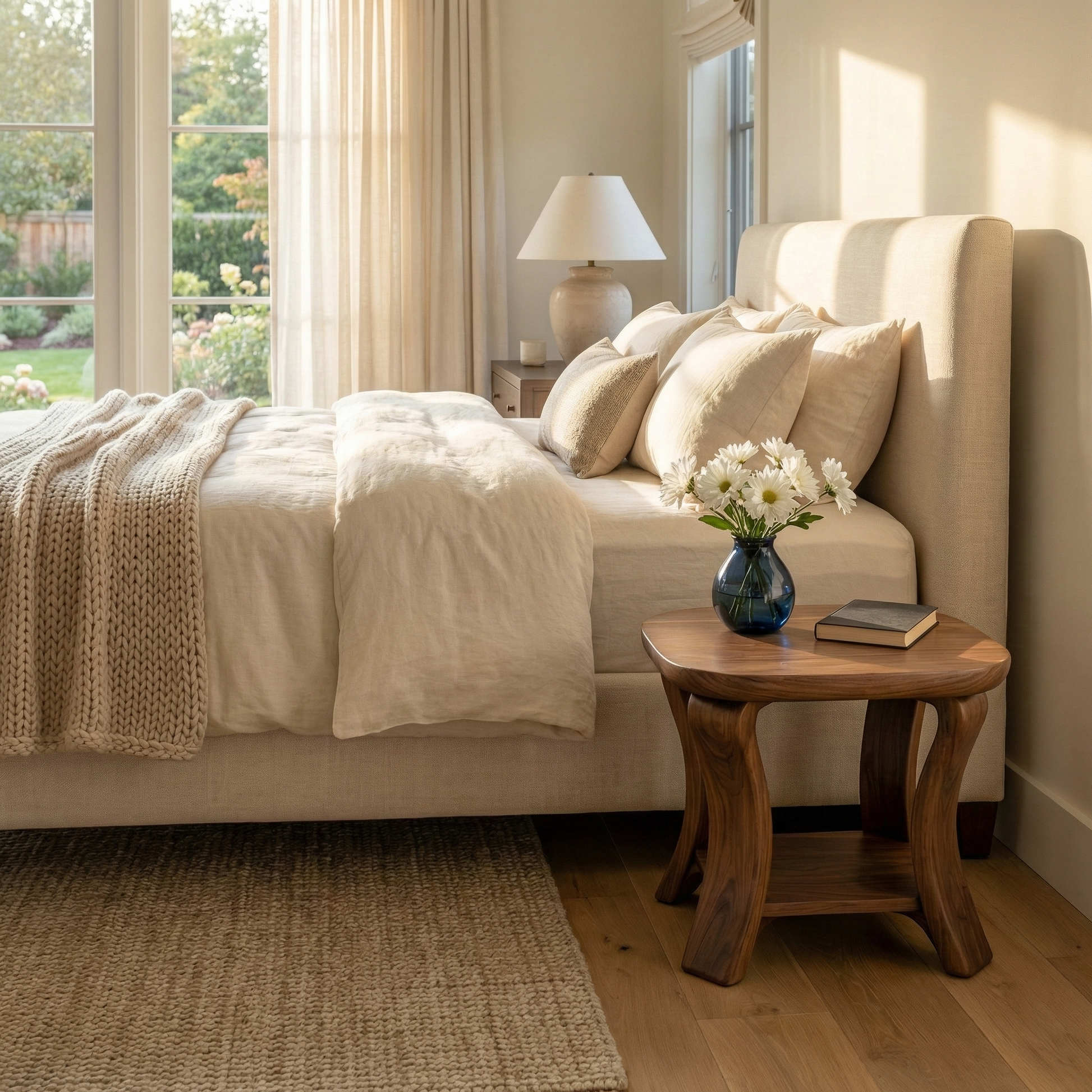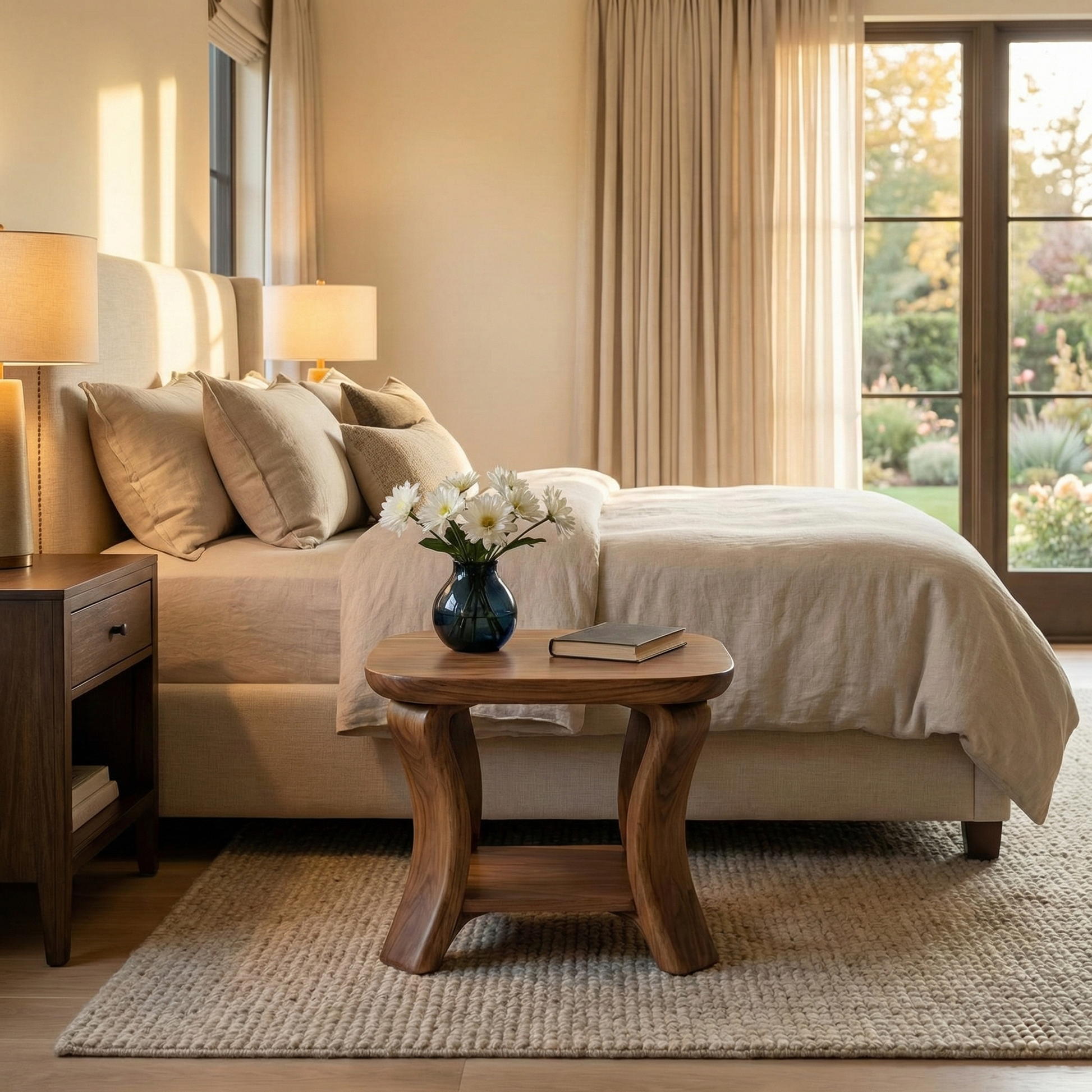 A handcrafted solid wood side table featuring a softly rounded top, sculpted curved legs, and a functional lower shelf for books or décor. Its warm natural grain and balanced proportions make it ideal beside a sofa, armchair, or reading nook.
