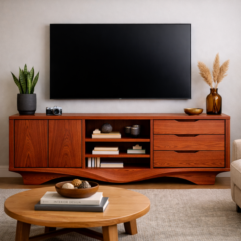 A solid wood TV cabinet and sideboard with a long, low profile and a sculptural curved base. Paneled doors, open shelving, and smooth integrated drawers create a clean storage layout with a warm, natural wood presence.