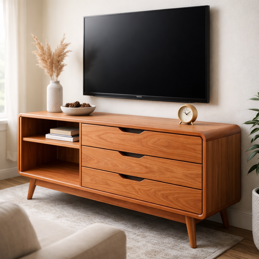 A handcrafted solid wood TV console featuring sleek, modern design with three storage drawers and an open compartment for media devices. Its smooth lines, rounded edges, and rich natural wood tones create a warm, minimalist focal point for your living room.