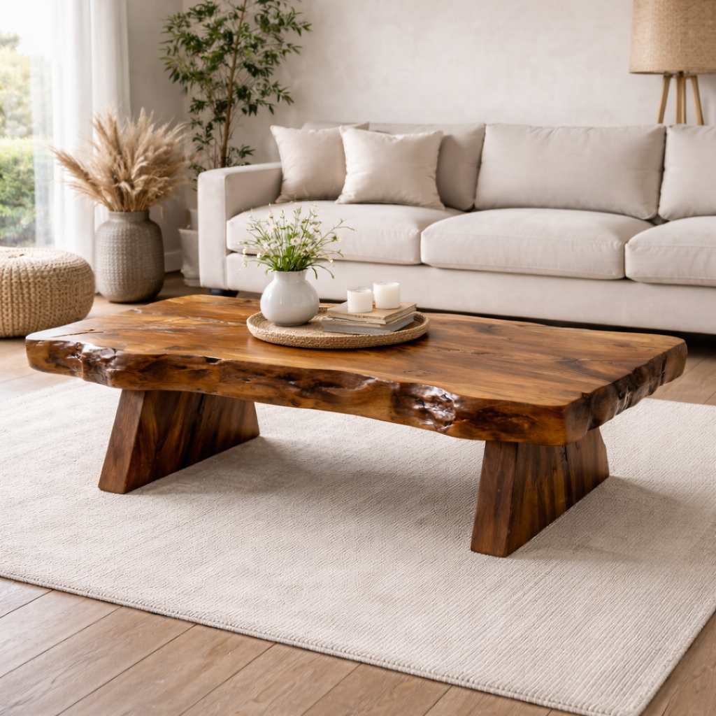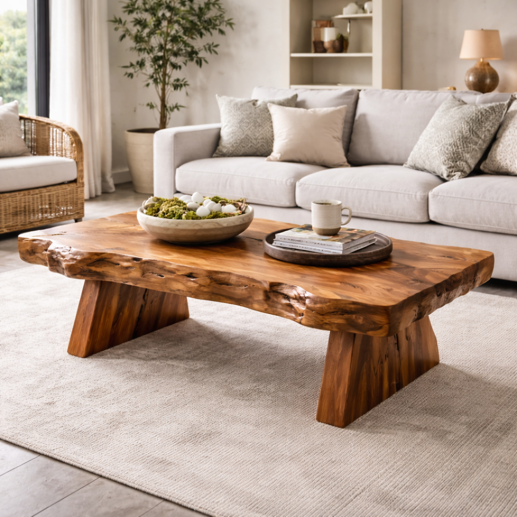 Live Edge Solid Wood Coffee Table With Sculptural Base