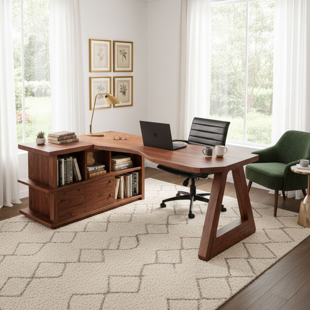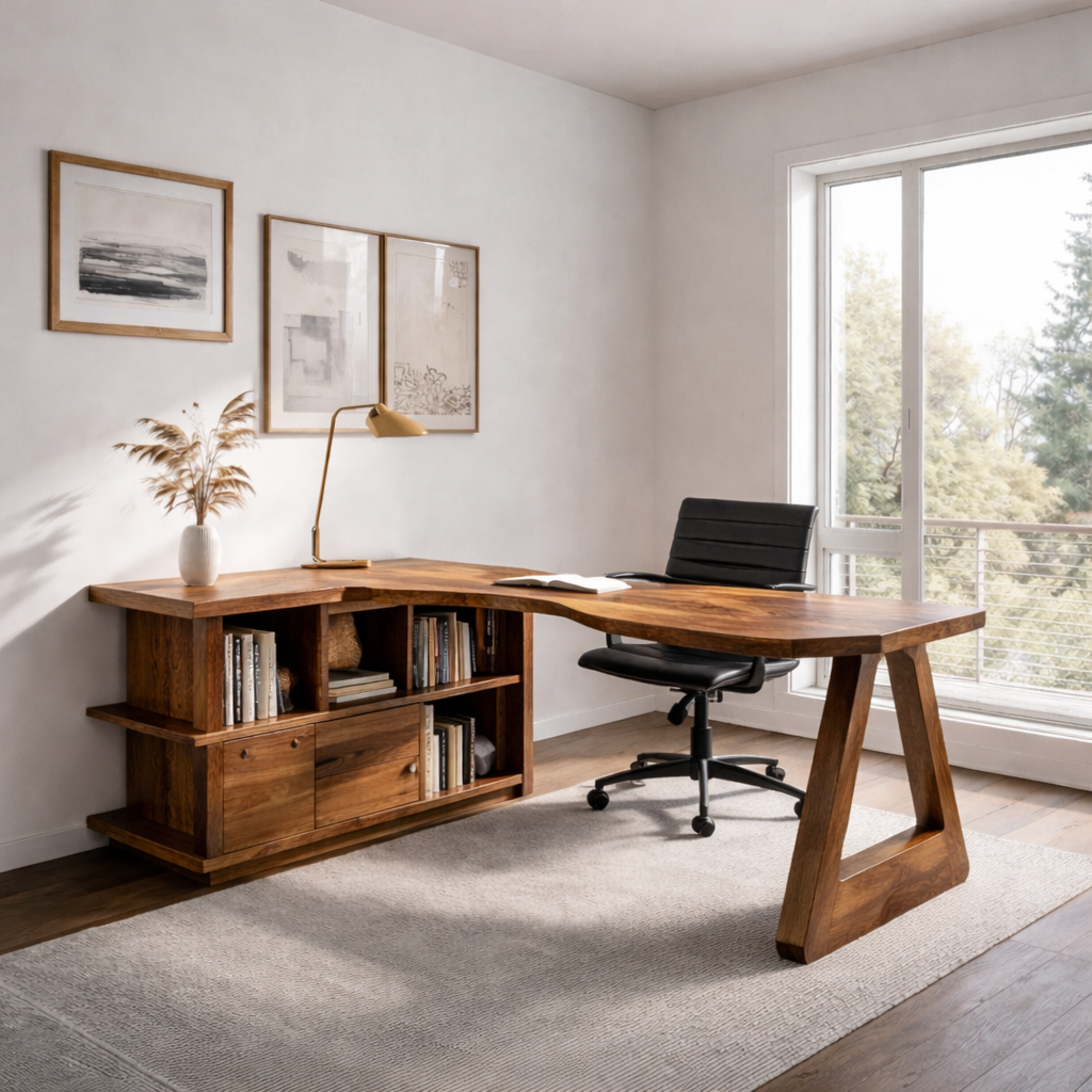 A sculptural L-shaped desk handcrafted from solid natural wood, offering a spacious workspace combined with integrated storage. The sleek design highlights rich wood grain, while the built-in bookshelf provides practical storage for books, documents, and décor. This functional desk is designed to elevate home offices and professional spaces with its modern aesthetic and organic warmth.