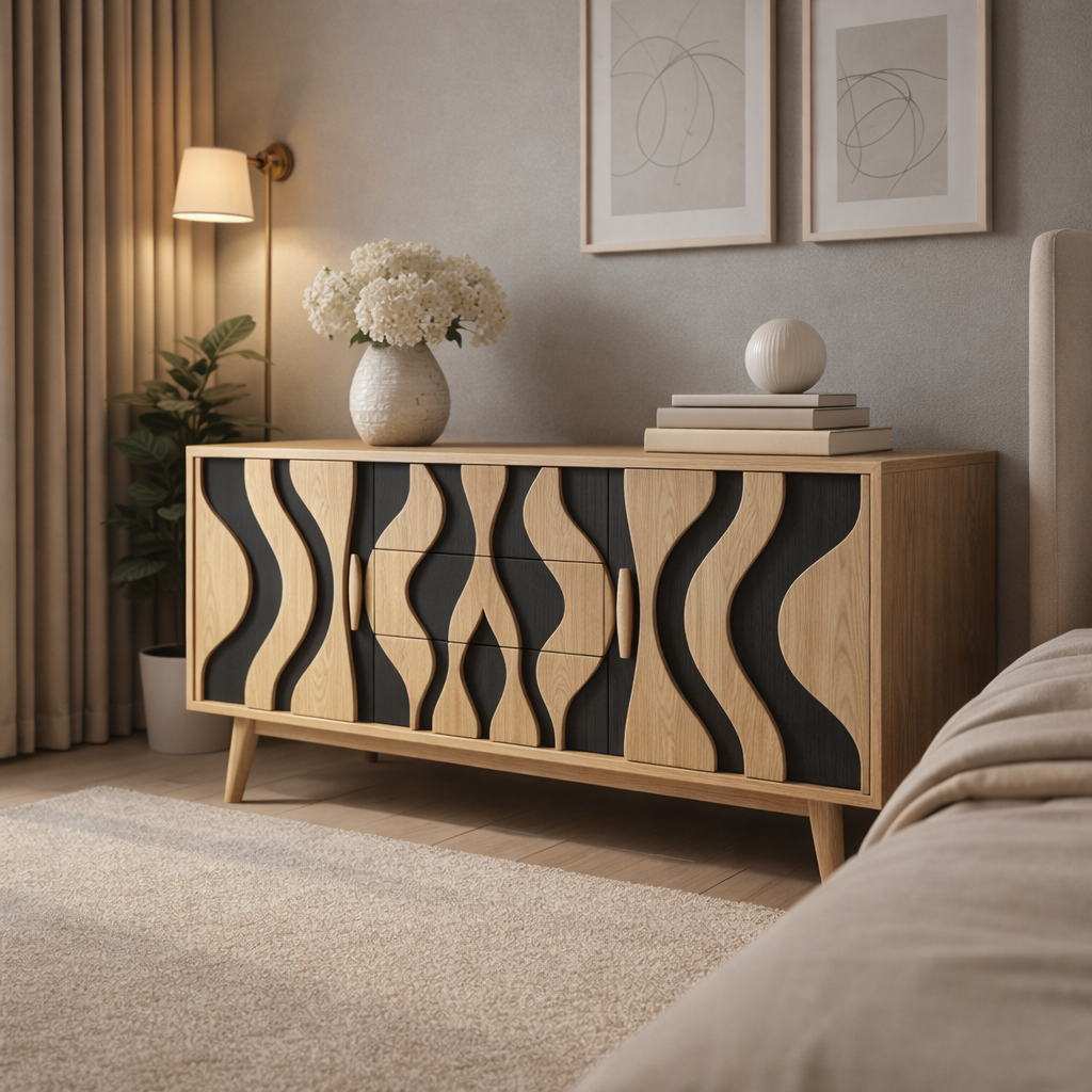 This striking modern console or TV stand features a beautifully crafted design with a mix of natural wood tones and bold black detailing. The fluid, wave-like patterns across the front create an eye-catching contrast, blending organic beauty with modern flair. Perfect for living rooms or entertainment spaces, this piece provides functional storage and a distinctive visual impact. The sleek mid-century legs elevate the entire design, offering a clean, minimalist aesthetic that suits a variety of interior styles.