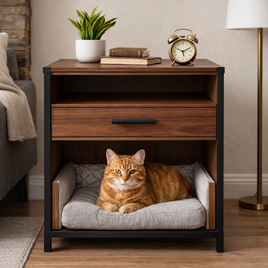 - Form: Compact nightstand with integrated pet bed area and a drawer