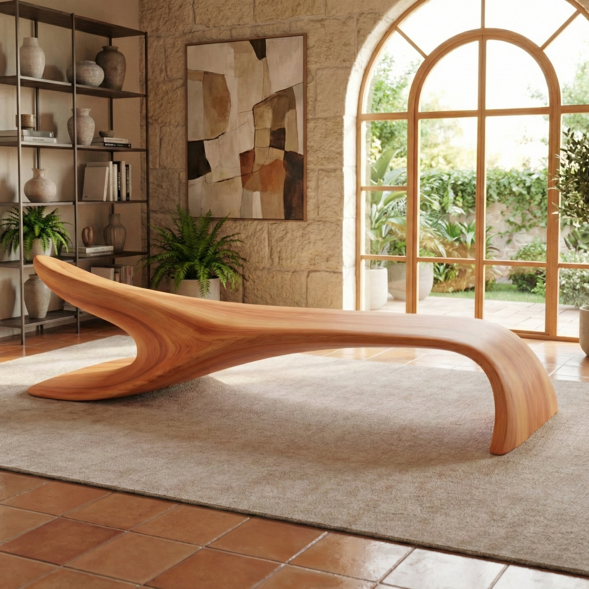 This sculptural bench showcases an organic, flowing design that seamlessly combines form and function. The smooth, curving lines of the wood create a sense of movement and elegance, making it a statement piece for any space. Crafted from solid, rich-toned wood, this bench features a beautifully contoured structure, perfect for use in entryways, living rooms, or as a unique addition to modern interiors. The understated, minimalist design emphasizes the natural beauty of the wood while providing a functional seating solution.