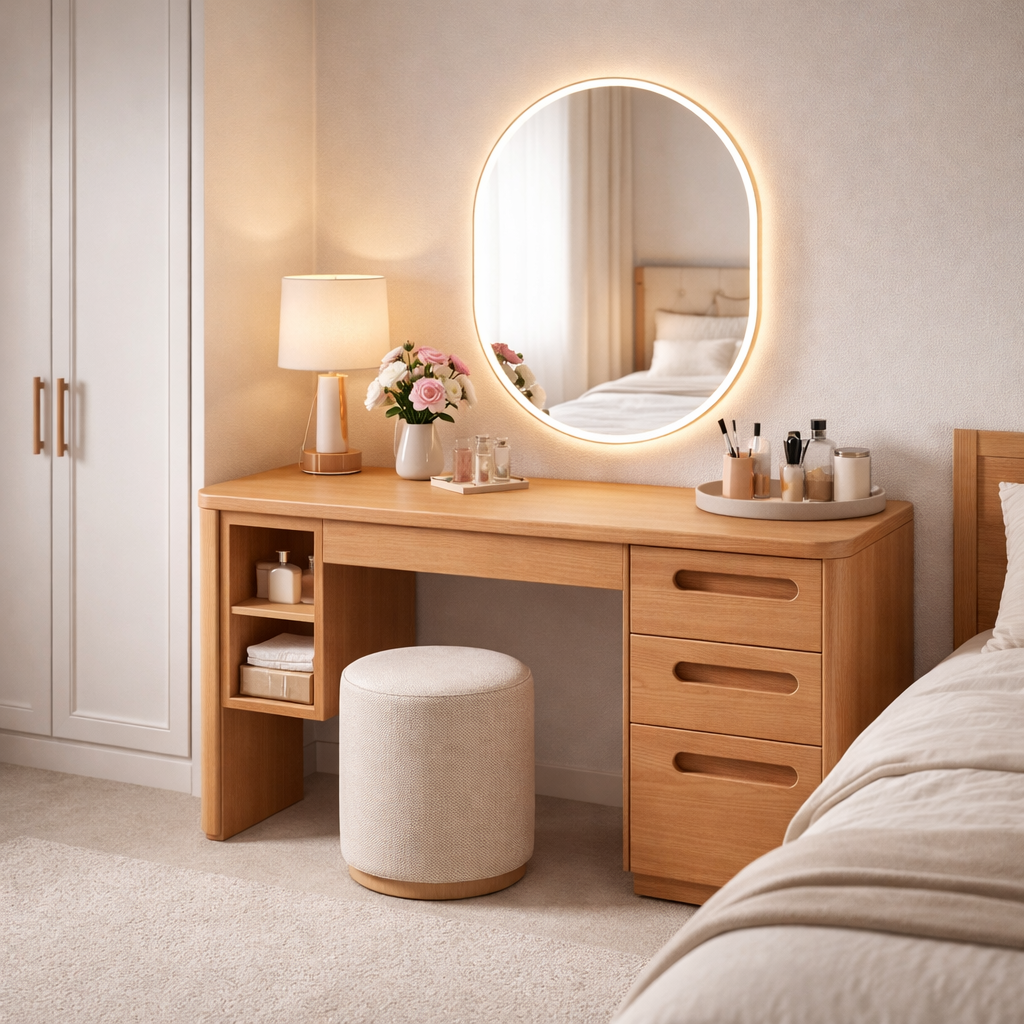 A refined wooden vanity table handcrafted with warm natural tones and a clean, modern silhouette. The design features a smooth, soft-close drawer for daily essentials, with an open shelf for easy access to accessories or décor. Its clean lines and sculptural base provide stability while elevating your space. Perfect for bedrooms, dressing areas, or personal spaces, this vanity brings beauty and function with timeless appeal.