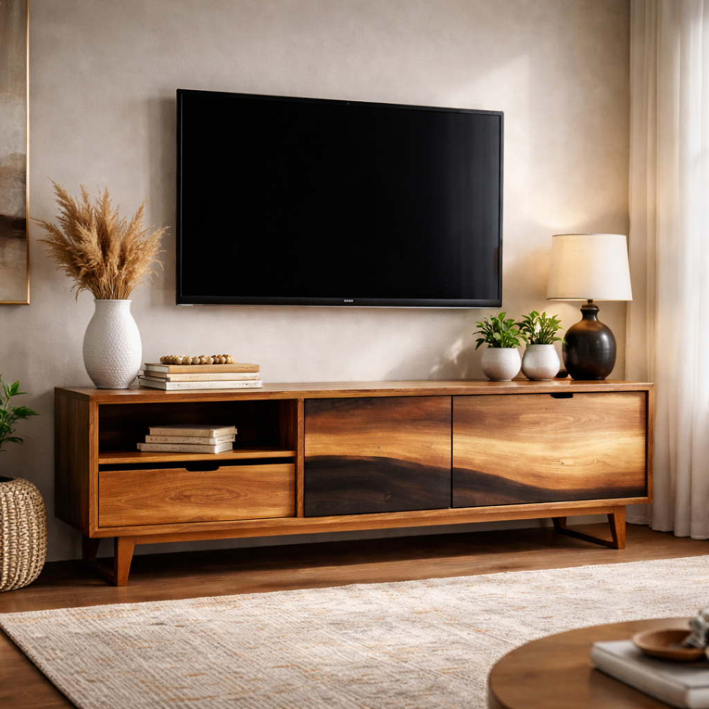 Sleek TV Stand with Live Edge Detailing and Open Storage Space